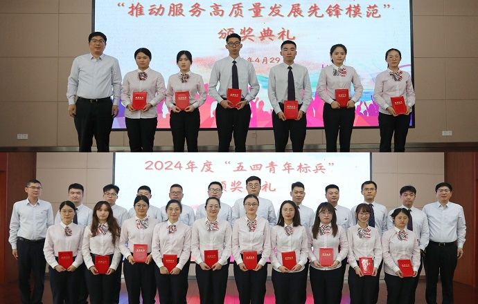 团委书记聂蕾懿宣读绍兴银行“推动服务高质量发展先锋模范”和2024年度“五四青年标兵”表彰文件,金建康书记、朱志祥副书记为荣获表彰的优秀青年员工颁奖。