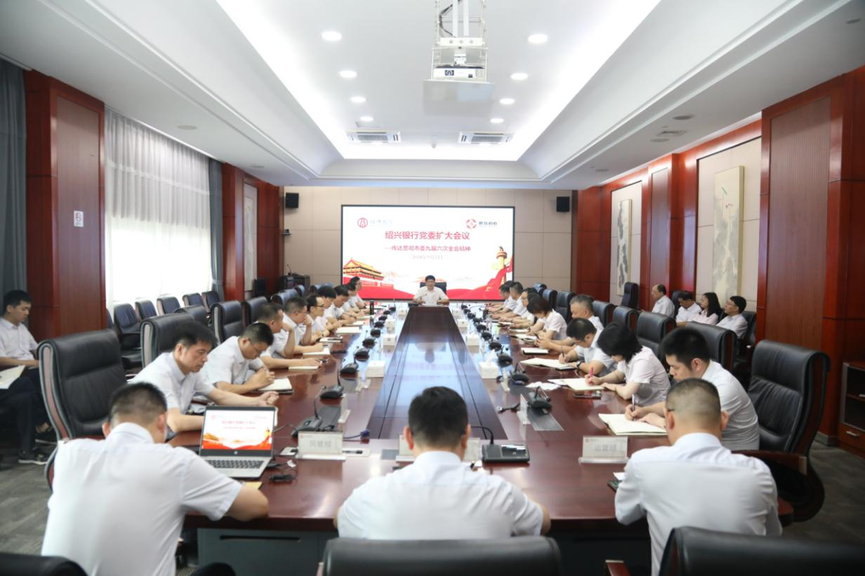 9月2日上午,我行召开行党委扩大会议,传达贯彻绍兴市委九届六次全会精神,党委书记、董事长金建康主持会议并作中心发言,党委副书记、行长陈军,党委副书记、监事长许江军作交流发言,行党委班子成员参加,总行各部(室)负责人列席。